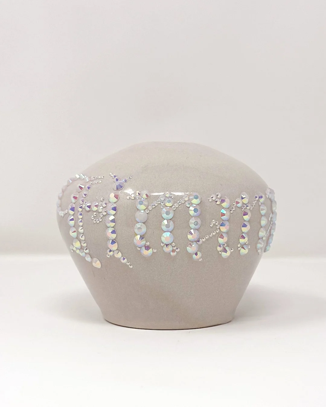 4 inches tall, 5 inches wide, created in 2025. Thrown ceramic, hand painted with underglaze, bedazzled with resin rhinestones.